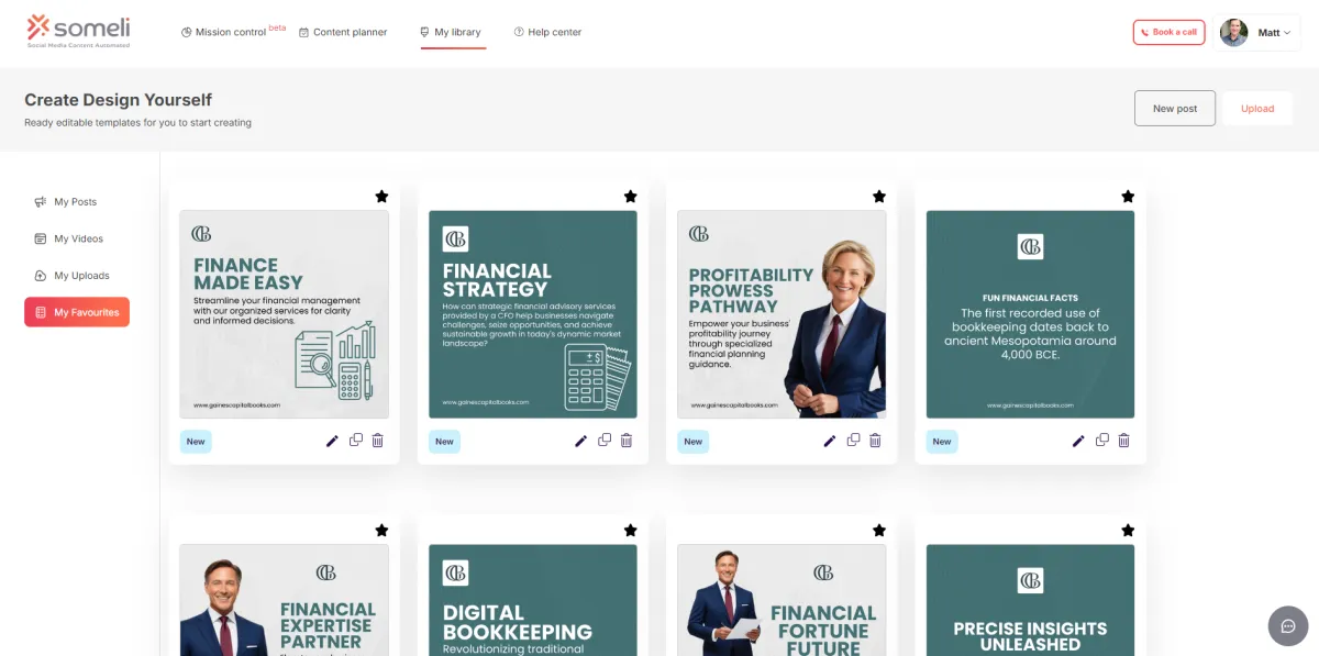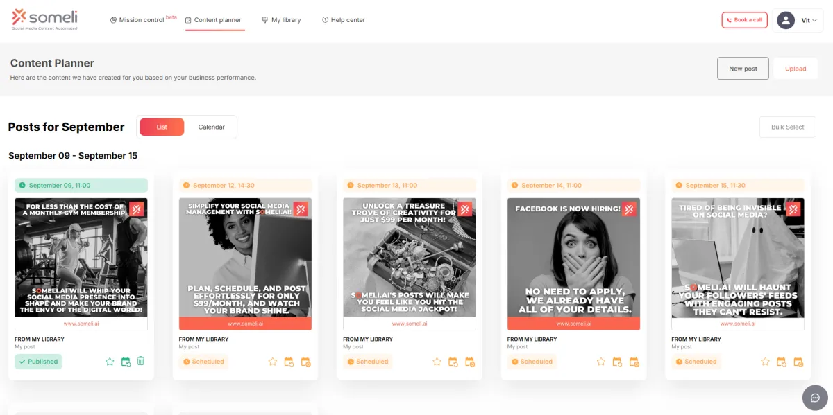 Someli AI’s My Library feature allows you to keep all your social media posts in one place, making it easy to manage and reuse content. Whether you’re working on new posts or revisiting previous campaigns, My Library provides a centralized hub where you can store images, videos, captions, and templates.