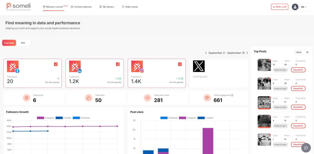 Someli AI’s Dashboard gives you a complete overview of how your social media posts are performing. From likes, shares, and comments to more detailed metrics like engagement rates and audience growth, the dashboard provides insights into the effectiveness of your content.